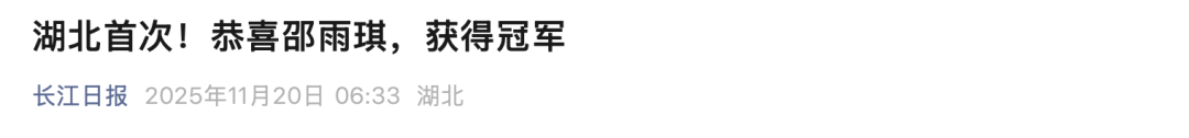 而后,邵雨琪先后夺得2021年室内田径邀请赛冠军、2022年宇宙田径大奖赛冠军、2024年宇宙田径锦标赛冠军。2025年11月19日,她更是在全运会「女子跳高」的赛场上,凭借“1.90米”的收货,夺得冠军,为家乡湖北,赢得了首枚全运会跳高金牌。
