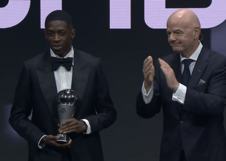 虎扑12月17日讯2025FIFA受奖仪式仍是死一火,巴黎圣日耳曼前卫乌斯曼-登贝莱取得了FIFA年度最好球员的奖项。